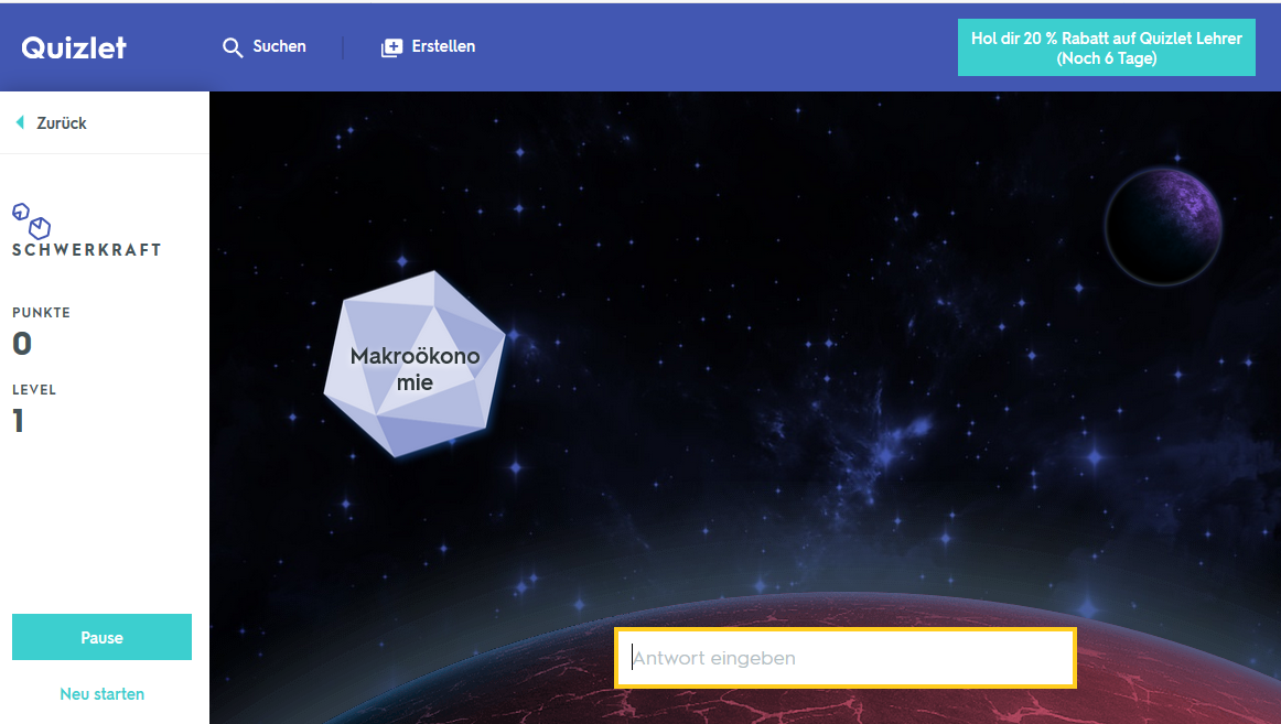Mit Quizlet können Studierende unkompliziert – auch unterwegs – Lernstoff mittels Karteikarten, Lernsets und kurzen, spielerischen Tests erarbeiten und verinnerlichen. Die App dokumentiert den Fortschritt ihres Lernprozesses und die Lernenden wissen, mit welchen Themengebieten sie sich noch intensiver auseinandersetzen müssen. Abb. 19: Feedback zu einer Karteikarten in Quizlet Mit Quizlet können vor allem Faktenwissen und Begriffsdefinitionen abgefragt werden. Auch Diagramme und interaktive Schaubilder sind problemlos zu erstellen und mit Punkten, Begriffen oder Definitionen zu vermerken. Abb. 20: Schaubild in Quizlet Quizlet bietet zwei Spiele-Funktionen: "Zuordnen" und "Schwerkraft". Ersteres ist ein Spiel, bei dem Studierende Begriffe und Definitionen (oder Bilder) so schnell wie möglich einander zuordnen müssen. Bei "Schwerkraft" müssen die Antworten eingegeben werden, während Asteroiden (mit den Fragen/Vokabeln) nach unten sinken. Je höher der Level des Spiels, desto schneller fallen die Asteroiden. Abb. 21: Spiel "Schwerkraft" in Quizlet Quizlet Live bietet eine Quiz-Funktion, in der zwei Gruppen gegeneinander antreten, und im Quizlet Lernmodus werden individuelle Lernpläne und -strategien für die Nutzer/innen erstellt. Karteikarten mit falsch beantworteten Fragen werden zurück gereiht und immer wieder abgefragt, sodass die Studierenden diese laufend wiederholen. Nach jeder Runde wird der Lernfortschritt angezeigt. |