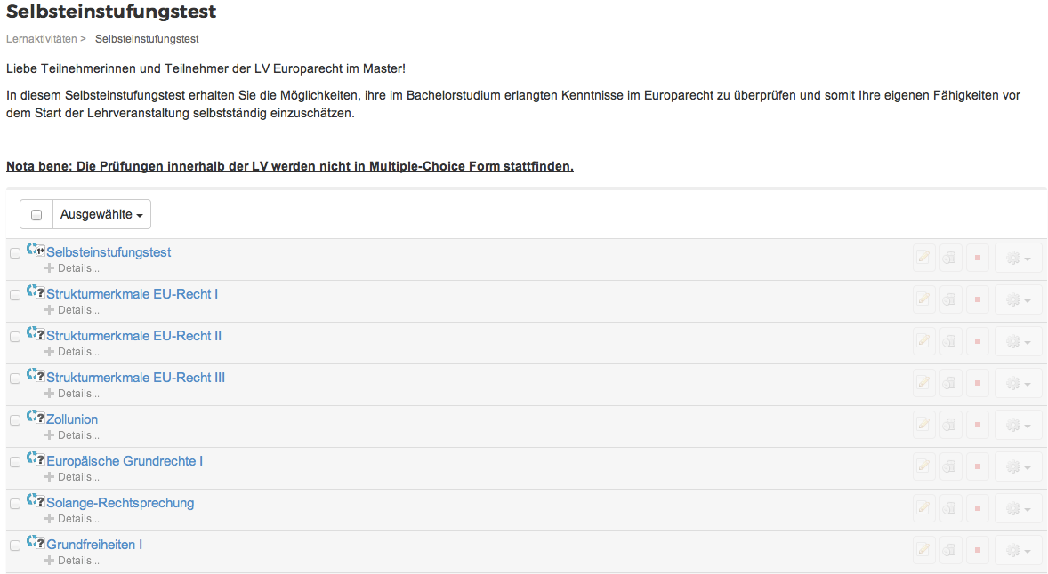 Selbsteinschätzungstests sind Tests, die aus mehreren Fragen bestehen, die von Studierenden in einer vorgegebenen oder beliebigen Reihenfolge bearbeitet werden. Nach Abschluss des Tests erhalten die Studierenden unmittelbar Rückmeldung zu ihrem Ergebnis. Diese Rückmeldung stellt für Studierende ein hilfreiches Feedback dar und liefert Anregungen für den weiteren Lernprozess. Innerhalb eines Selbsteinschätzungstests können verschiedene Fragetypen kombiniert werden, i. d. R. jedoch nur jene, die automatisch vom System ausgewertet werden können, zum Beispiel Multiple-Choice-Fragen, Reihungsfragen oder Lückentext-Fragen. |