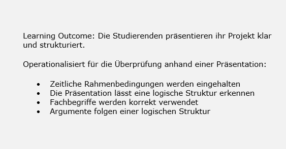 Eine Möglichkeit Beurteilungskriterien anzuwenden besteht darin, sogenannte Rubrics zu formulieren: Rubrics kombinieren Beurteilungskriterien mit Abstufungen der Erreichung dieser Kriterien. Nähere Informationen über die Erstellung und Anwendung von Rubrics finden Sie hier. Nähere Informationen über das "Formulieren von Learning Outcomes" finden Sie hier. |